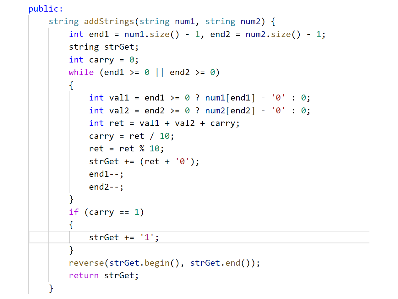 比如1234+56,这些字符串得先从取尾部开始相加,所以要分别定义end1和end2指向尾部。然后从end1和end2指向的位置开始取值,取完后就向左走,都取完才结束;因为不确定有没有值,所以可以用个三目,如果有就取出字符,没有就给0;因为取出的值要和进位值一起相加,然后判断进位值需不需要改的问题,这里是整型运算,所以取出的字符记得减去字符0,最后结果经过模10和除10处理后进行是否修改进位值和放到一个新串里,放的时候记得变为字符;放到新串的值是从头开始放的,所以最后记得逆置一下: