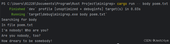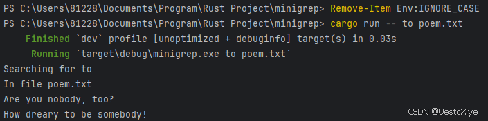 让我们运行 cargo run -- to poem.txt > output.txt 命令,这次不会报错,将标准输出重定向到文件。我们不会看到任何输出到终端,output.txt 将包含我们的结果。