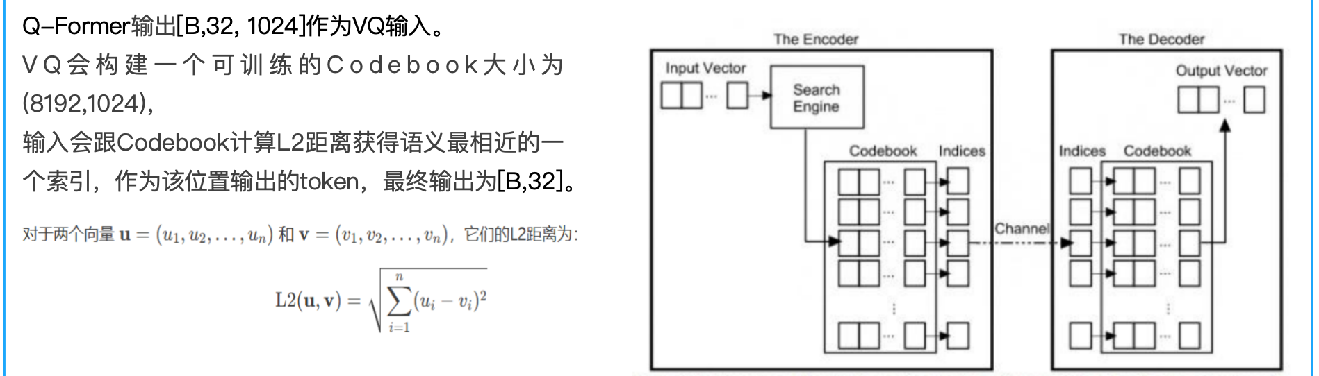 VQ 编码器 构建Codebook(8192,1024),计算每个token对于Codebook的L2距离,找到距离最近codebook向量作为输出。