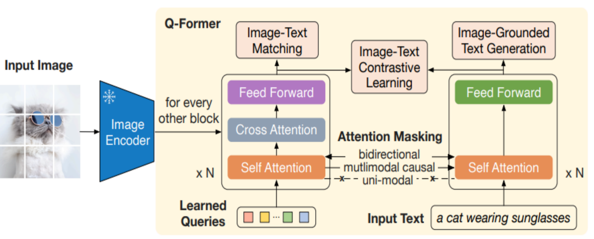 因果 Q-Former类似于多头注意力,预先生成Q[B, 32, 1024],ViT结果作为KV,经过Cross-Attn,输出[B, 32, 1024]进入Causal-Attn生成掩码。