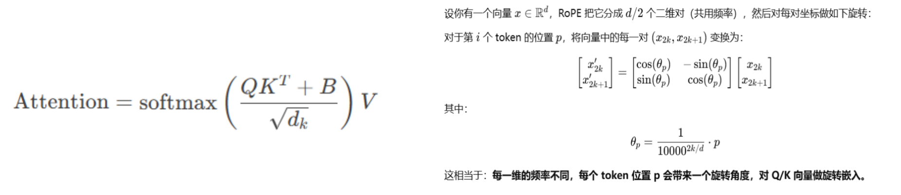 RoPE的解决方案: 通过旋转操作,将位置信息以角度形式注入查询(Query)和键(Key)向量中。