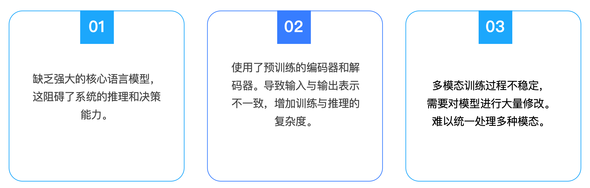 LLMs与单模态训练相比,观察到更高的损失,这阻碍了每个模态的最佳性能。提高多模态融合的潜在策略可能包括调整大语言模型和分词器,或采用专家混合(MOE)架构,以更好地管理多样化数据并优化性能。