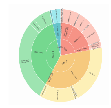 AnyInstruct 是一个由 108k 多模态指令跟踪数据组成的数据集,以交错的方式集成了多种模态------文本、语音、图像和音乐。首先使用 GPT-4 合成文本多模态对话,然后分别使用 DALL-E 3、MusicGen 和 Azure 文本转语音 API 生成图像、音乐和语音。语音部分包含 39 种不同的音色,语速在一定范围内随机采样。