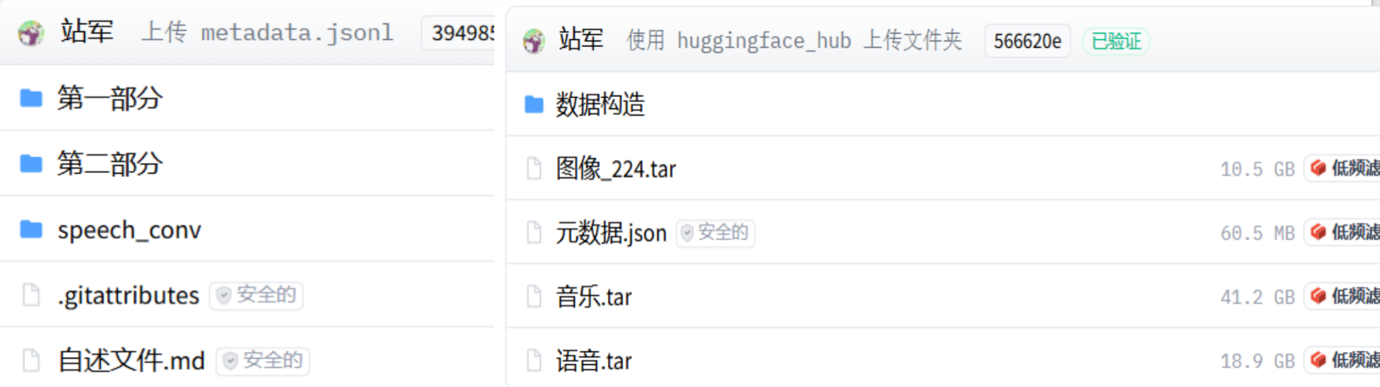 第一部分和第二部分的数据涵盖所有模态,总计 10.8 万条高质量多模态对话,包含多种多模态组合。该数据集包含约 20.5 万张图片、50.3 万条语音记录和 11.3 万首音乐曲目。而在data_construction文件夹中可以查看数据构建过程中的中间内容,例如主题、场景、图片和语音的字幕等。speech_conv目录包含语音对话。我们从现有的文本指令数据集中筛选出适合发声的对话,并进行语音合成,共计 108k 条。