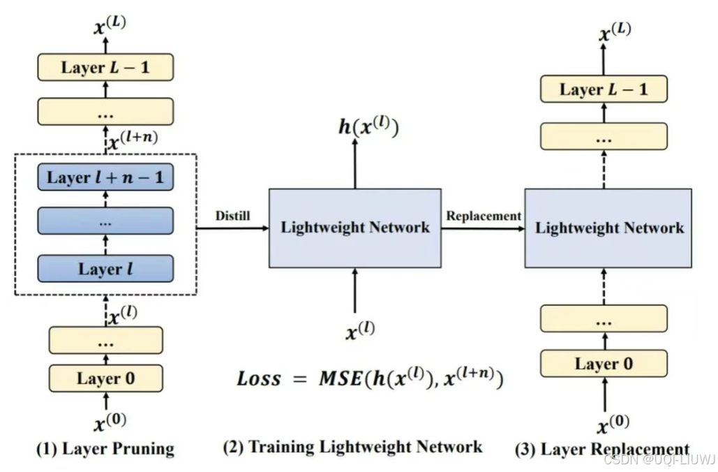 - 根据预定义的修剪率选择从 i 到 i+n 的层进行修剪后,从第 i 层的输入和第 i+n 层的输出中收集隐藏状态作为训练数据,并使用 MSE Loss 通过蒸馏来训练一个轻量级模型