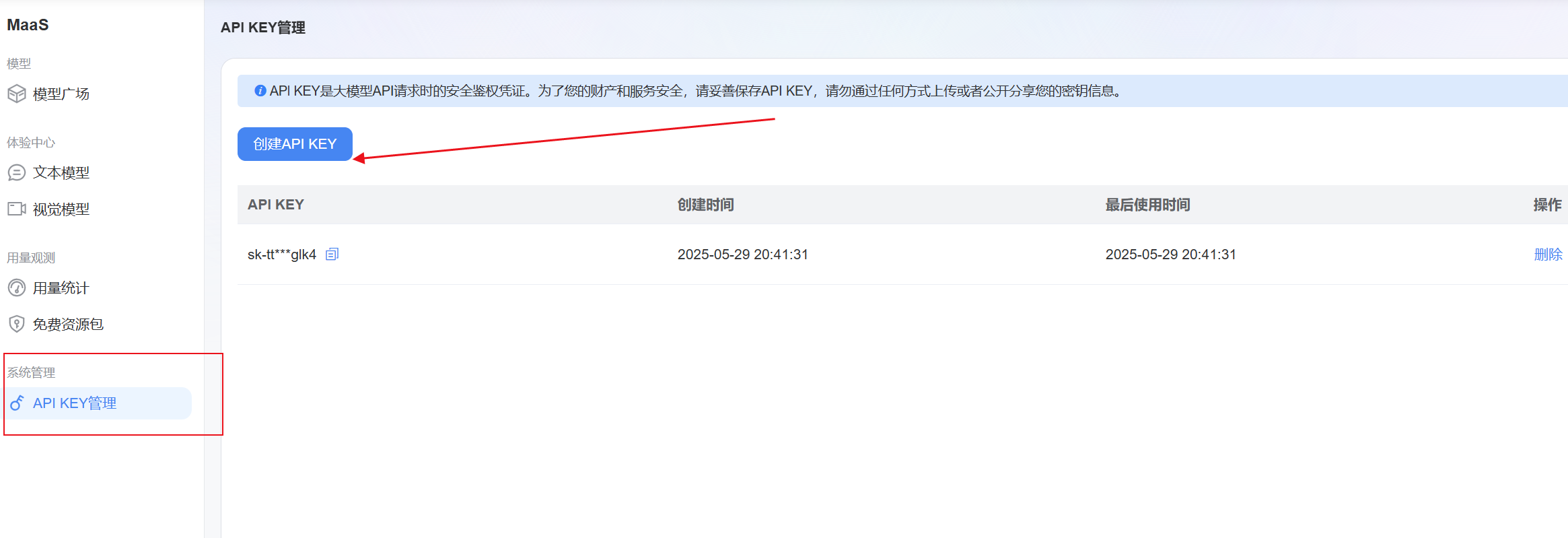 成功登录蓝耘平台后,点击Maas平台找到 "API KEY管理" 选项,点击 "创建API KEY" 平台将为你生成一串唯一的 API 密钥。这串密钥是你调用蓝耘 Maas 平台 API 的重要凭证,务必妥善保管,切勿向他人透露,以免造成安全风险。