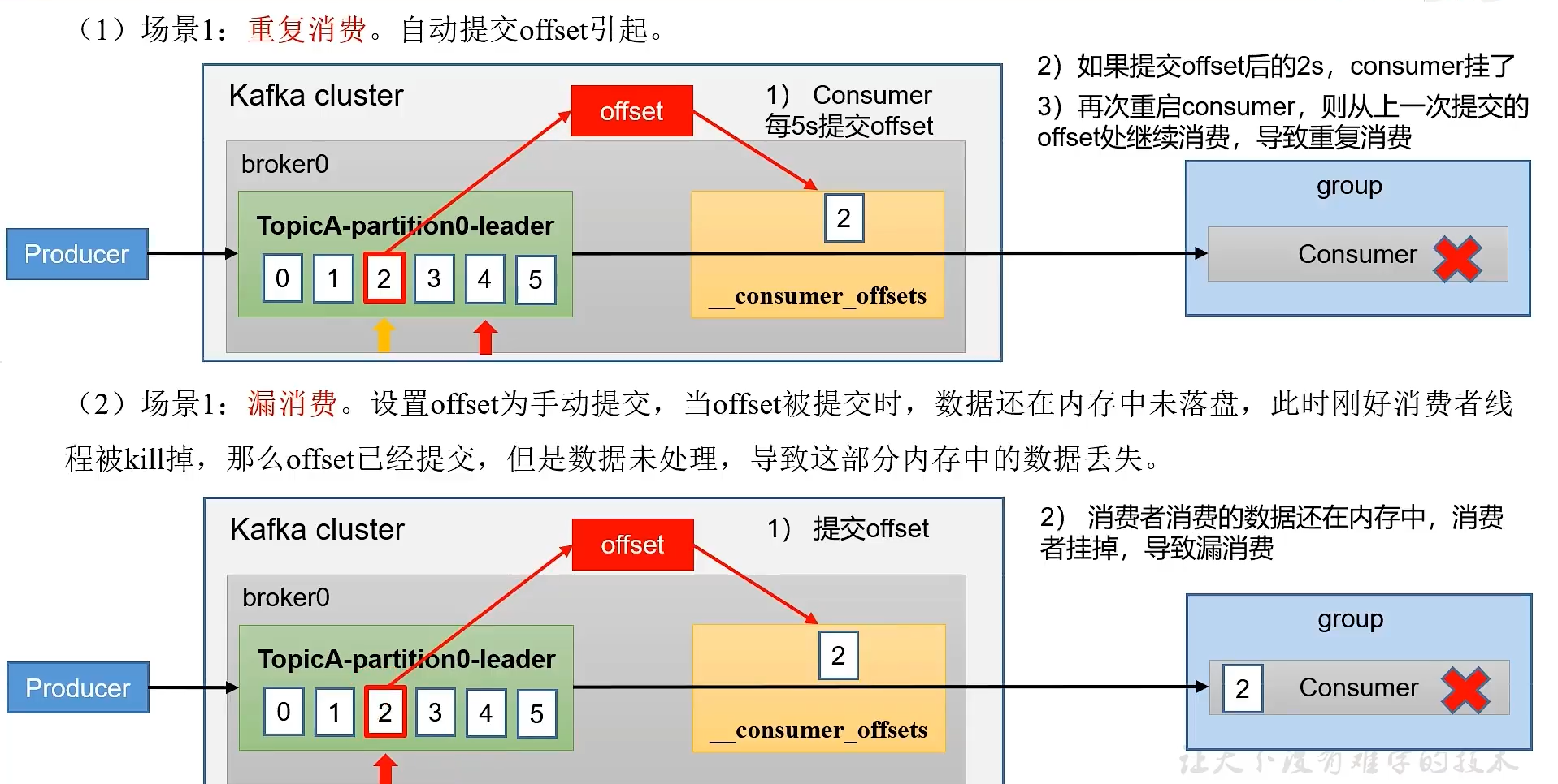 漏消费:先提交offset后消费,有可能会造成数据的漏消费