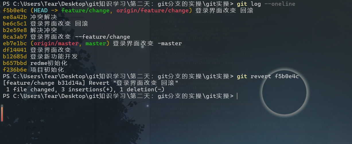 我们不小心提交了"增加登录功能",现在想撤销该提交的影响,但不想破坏提交历史(比如已经 push 到远程)。