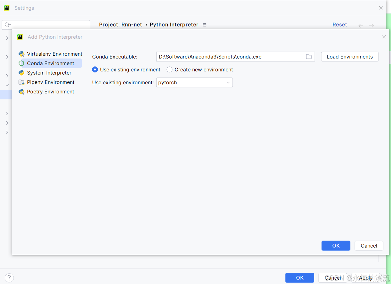 1.Pycharm选择如下,运用现存的环境,选择pytorch即可。