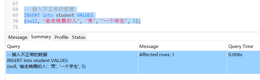 sql-- 插入不正常的数据 INSERT into student VALUES (null, '偷走晚霞的人', '男', '一个学生', 5);