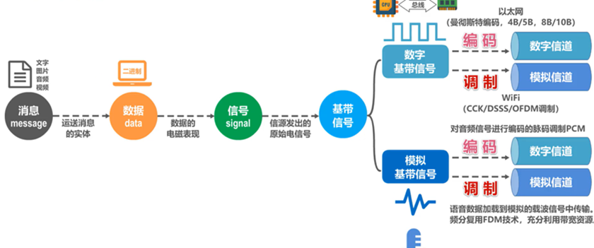 信号需要在信道中进行传输,信道可分为数字信道 和模拟信道 两种。在不改变信号性质的前提下,仅对数字基带信号的波形进行变换,称为编码 。编码后产生的信号仍为数字信号 ,可以在数字信道中传输,如以太网使用曼彻斯特编码,4B/5B,8B/10B等编码。