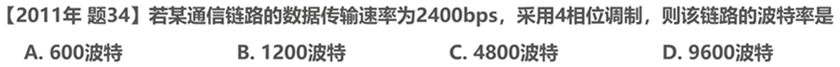 其次,题干说该链路的数据传输速率为2400bps,也就是2400 bit/s。而数据传输速率等于每秒传输的比特,换句话说,就是每秒传输的码元(码元传输速率)与单个码元所携带的信息量的乘积,同时前面讲过波特率就是码元传输速率 .所以可以计算得出该链路的波特率为 数据传输速率 / 单个码元携带的信息量 = 2400 bit/s / 2 bit/ 码元 = 1200 码元/ 秒,也就是1200 波特。因此本题选择B。