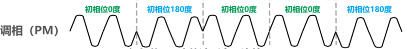 最后是**调相(PM)**所产生的模拟信号,如下图,这里初相位0表示比特0,初相位180表示比特1。