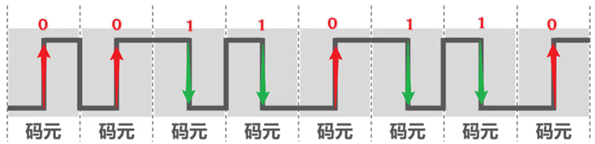 如图所示,在每个码元时间的中间时刻信号都会发生跳变,例如负跳变表示比特1,正跳变表示比特0 。码元中间时刻的跳变既表示时钟,又表示数据。传统以太网使用的就是曼彻斯特编码。