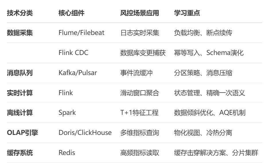 风控系统的核心能力依赖于以下大数据技术栈: