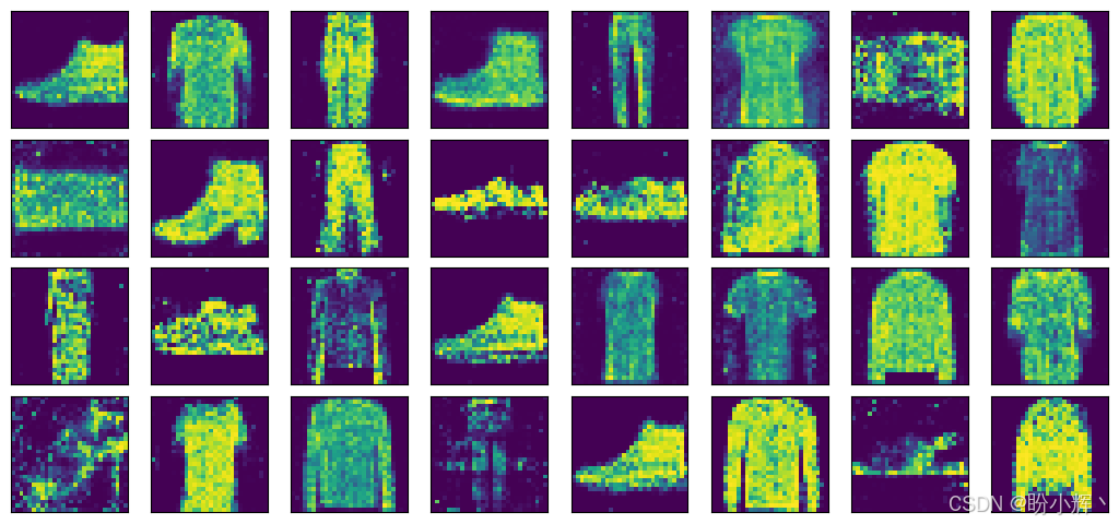 每训练 10 个 epoch,可视化生成的服装,如上图所示。经过 10 个 epoch 的训练后,模型已经能够生成明显可以作为真实服装的图像,能够明显的辨别出图像的外形,随着训练的进行,生成的图像质量越来越好。