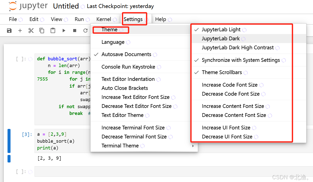 主题与深色模式。Jupyter Notebook默认的是白色主题,现在Jupyter Notebook 7内置几种主题及字体大小设置选项: