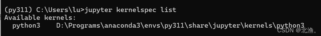 一般情况下随anaconda自动安装的jupyter notebook会默认安装在conda的虚拟环境base下,并做为conda所有虚拟环境共有的功能组件形式,如果需要为某个单独的conda虚拟环境安装,需要先切换到具体的conda环境,再执行安装命令,此jupyter notebook安装仅在当前虚拟环境下生效。如下,在虚拟环境py311下安装jupyter notebook命令: