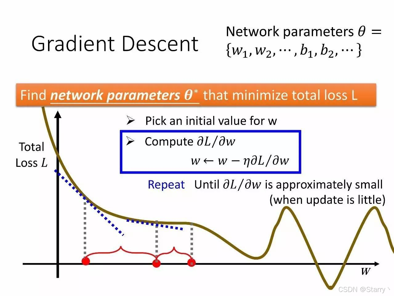 那么如何找到最优的 θ = { w 1 , . . . , w N , b 1 , . . . , b M } \theta=\{w_1,...,w_{N},b_1,...,b_{M}\} θ={w1,...,wN,b1,...,bM}使式(3)最小呢?方法就是著名的梯度下降法Gradient Descent,步骤如下。