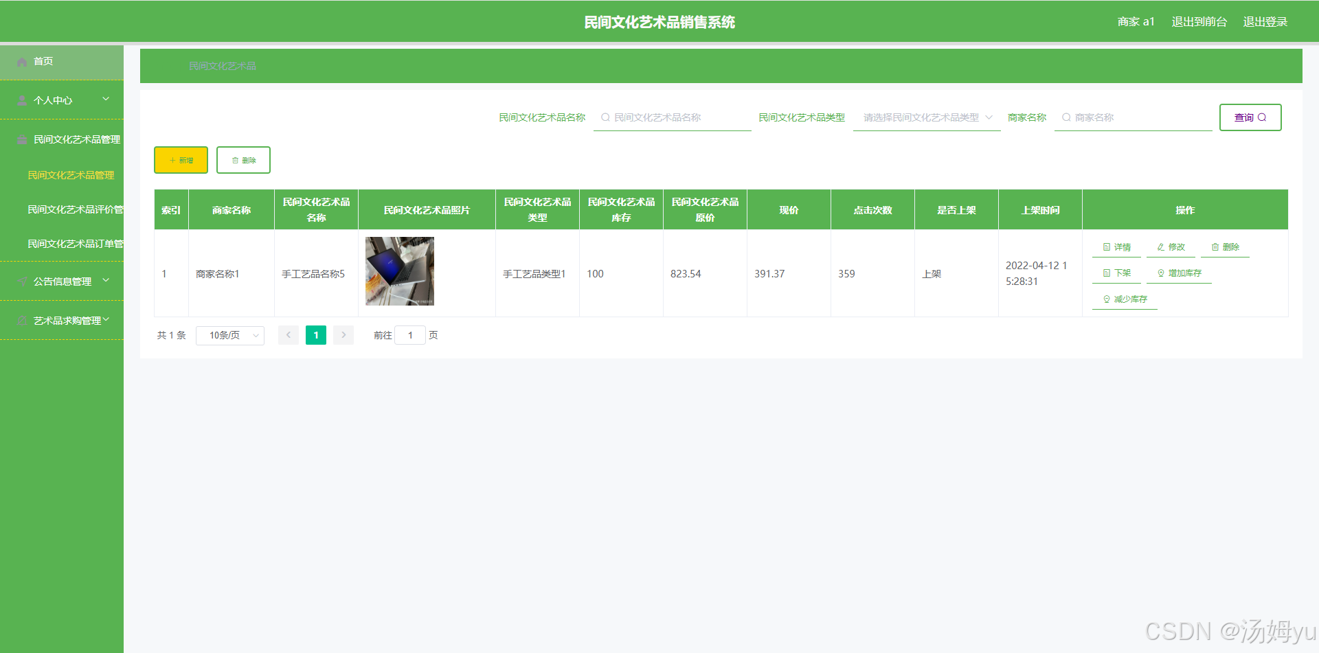 民间文化艺术品销售系统的研究主要聚焦在需求分析以及技术设计这两个关键的核心方面。在需求分析这个阶段,系统得好好地去调研市场的实际情况,要清清楚楚地明确用户对于艺术品进行浏览、购买、评价还有个性化推荐等诸多方面的需求,并且还得保证系统能够对艺术品的相关信息实现完整的展示以及高效的管理。从技术设计这个层面来讲,会选用Spring Boot框架来搭建系统,借助它所具备的诸如快速开发、内置容器以及自动配置等一系列的优势,以此来让开发流程变得更加简便,进而提升系统的稳定性以及可维护性哦。系统架构方面采用的是微服务设计模式,这样做是便于在后续的时候能够更加方便地进行扩展与升级操作。经过一系列的设计与实现工作之后,这个系统是要为用户给予一种一站式的民间文化艺术品销售方面的服务。