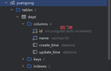 在数据库表中多的一方(员工表)、添加字段,来关联一的一方(部门表)的主键
