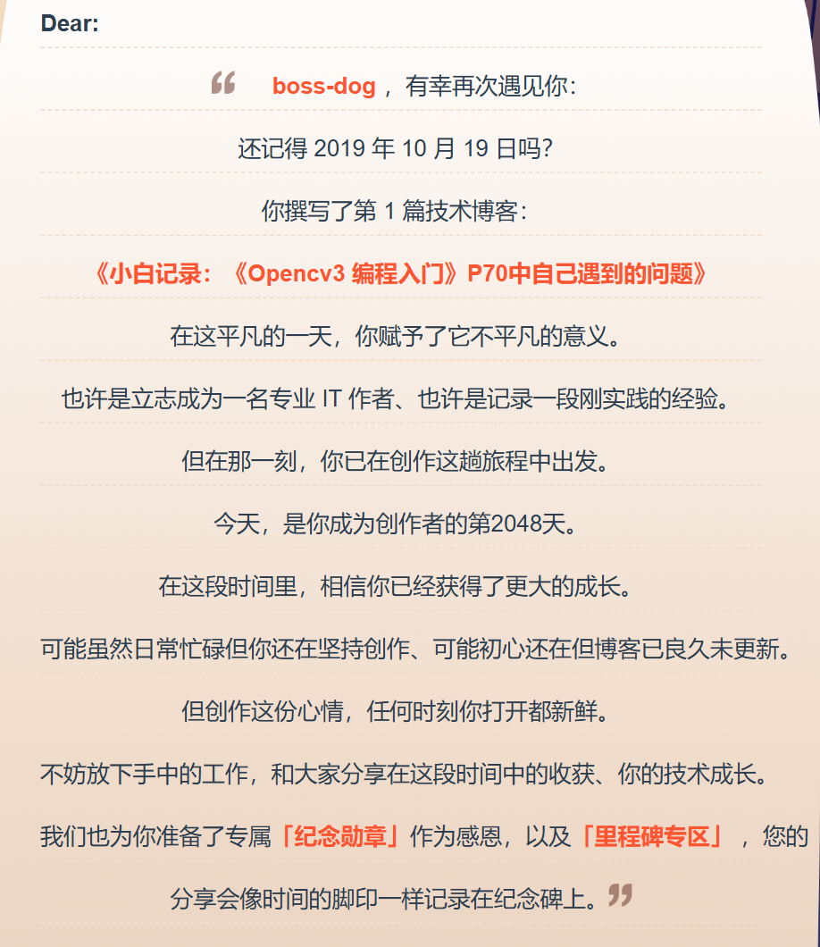 突然收到了CSDN消息通知,距离我写第一篇博客已经过去了2048天,回首过往,那时候的自己还在读研,转眼间已经工作快三年了。。。