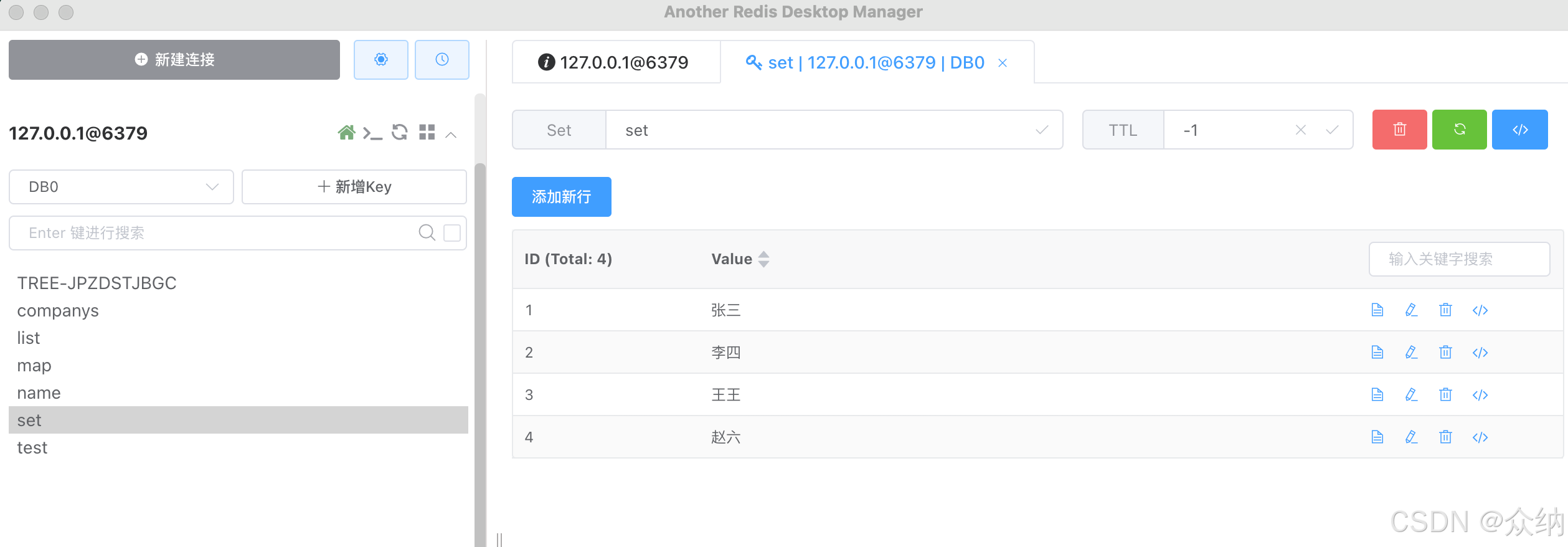 redisTemplate.opsForSet().add("set", "赵六");