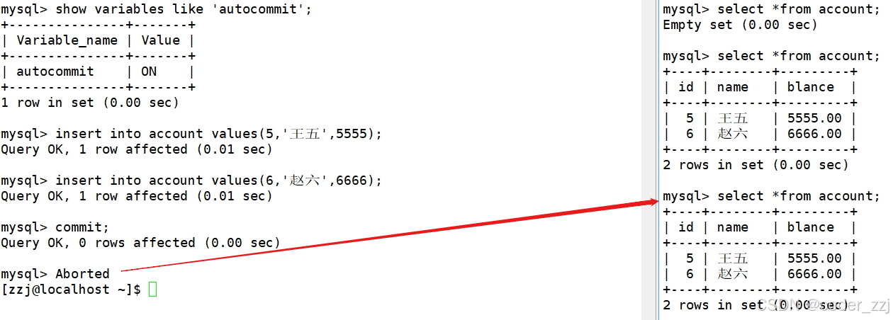 可以看到:两者的结果是完全一样的,说明 autocommit 不起作用