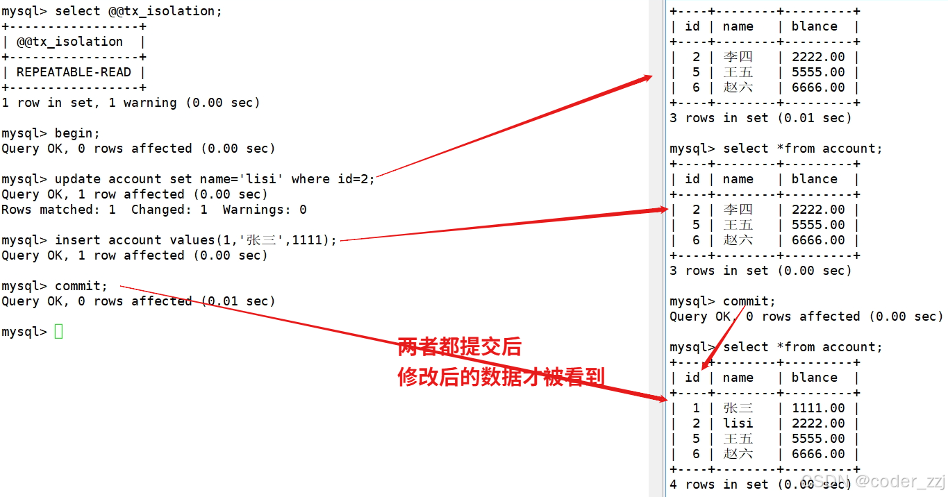 | 读提交 | 只有其中一方的事务结束了,另一方的事务才能看到 |
