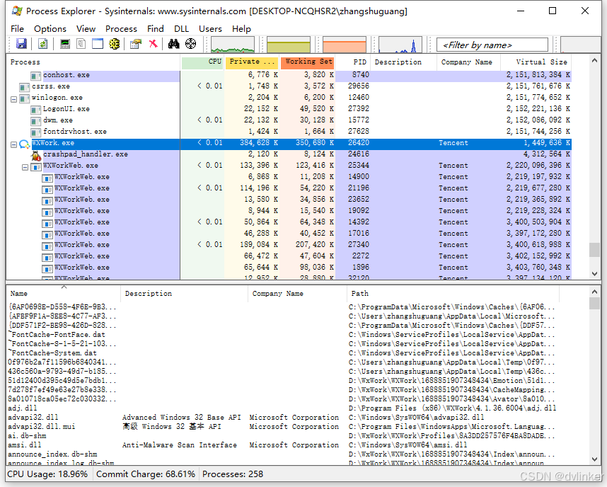 在使用System Informer过程中,观察到一个很好用的细节。目前的问题现象是,入会后,不将视频窗口最小化,即正常显示,观察Windows任务管理器,软件的CPU只占到30%左右,但将视频窗口最小化后,软件占用的CPU会飙到70%左右。在任务管理器中可以看到,整个系统中的CPU使用总和到达100%,导致整个Windows系统出现明显的卡顿。