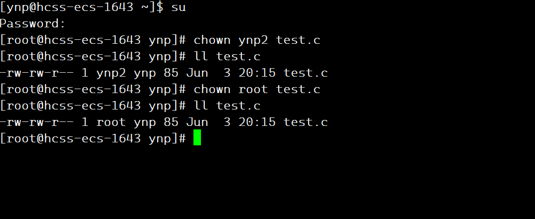 当test.c这个文件的拥有者被修改为ynp2这个账户的时候,ynp这个曾经的拥有者就没办法修改权限了,此时ynp是test.c的从属组了。