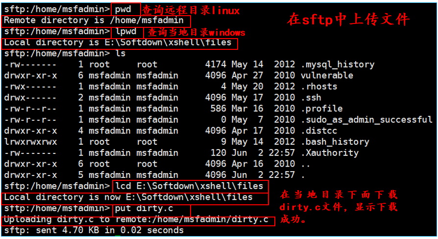 --在sftp中输入命令:dirty.c在windows的E:\Softdown\xshell\files目录下,将文件上传至linux中的/home/msfadmin目录。