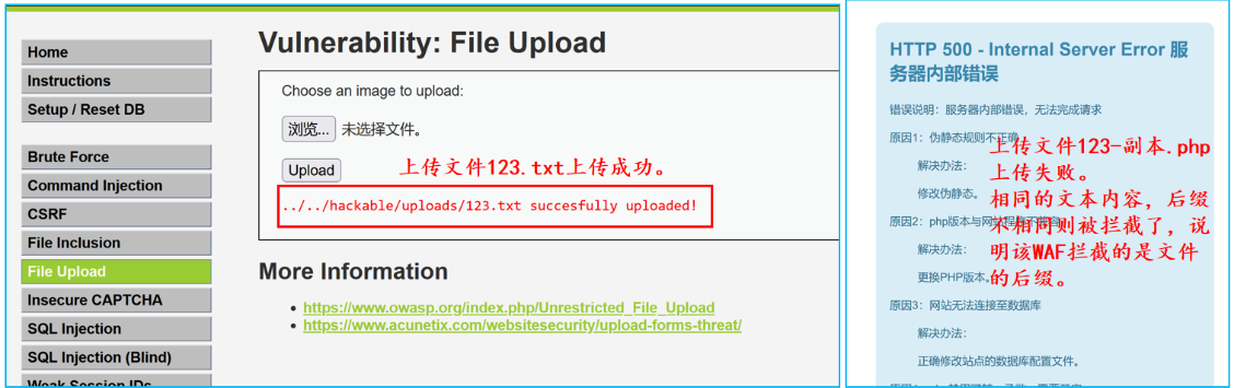 思路:要想要绕过WAF,第一步是要根据上传的内容找出来被拦截的原因。对于文件上传有三个可以考虑的点:文件后缀名,文件内容,文件类型。 第二步是根据找出来的拦截原因进行针对性的绕过。 在整个实验过程中,dvwa的环境为安全等级为低,只为了演示WAF的绕过方法。如果安全等级为中的话,则还需要进行文件类型的绕过(因为网站本身对文件类型有一个绕过)。 在没有WAF的情况下,文件上传就是上传带有攻击特性的木马文件,通过大小写,图片马,双写,文件类型更改等方式进行绕过。