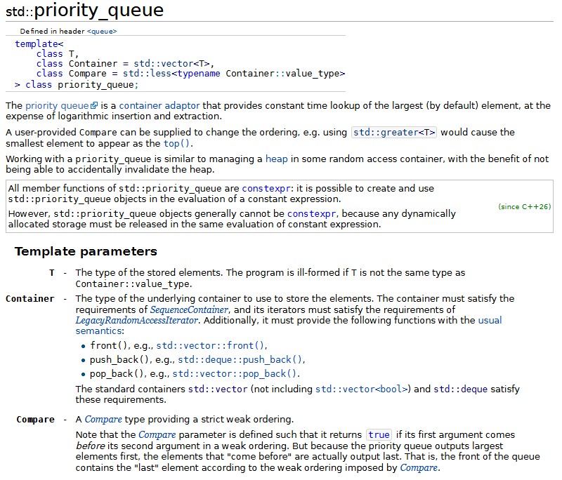 当把元素插入到priority_queue中时,它们按照优先顺序排序。如此以来,高优先级的元素(由对象创建时使用比较函数对象来决定)将是priority_queue中最先删除的。这通常使用堆排序技术来实现。默认的比较函数对象是less<T>,程序员也可以自己提供比较函数。