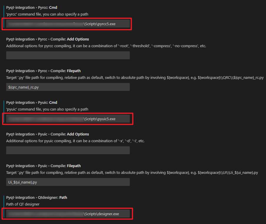 再在VsCode里给PYQT Integration配置插件位置,首先安装"文件------首选项------设置",在搜索栏写pyqt。按照下图所示的路径设置designer.exe、pyuic5.exe和prrcc5.exe的路径。
