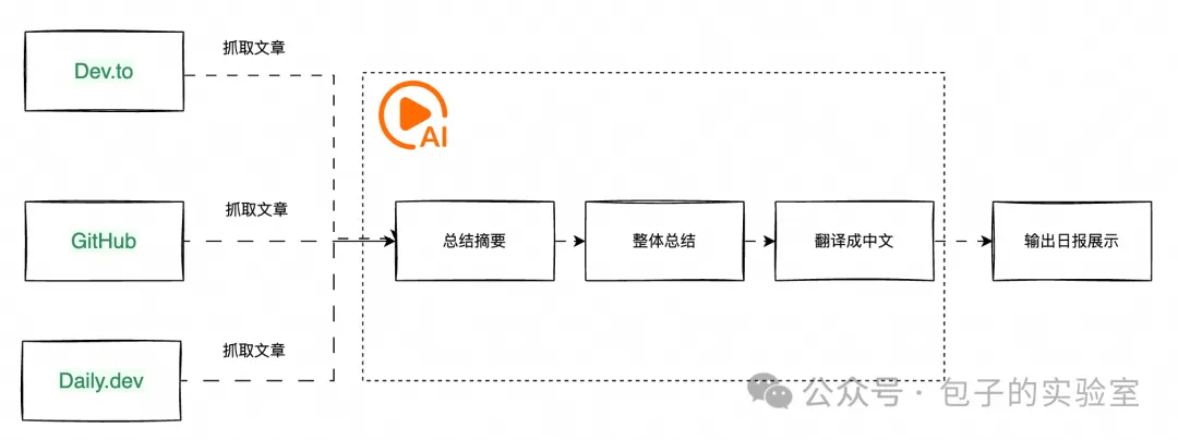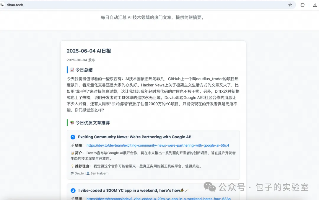 这个是我以前的一个想法了, 具体就是. 收集最新业界资讯的内容, 然后通过AI进行翻译、汇总, 最后推荐总结, 刷选出值得关注的科技日报信息推送出来.