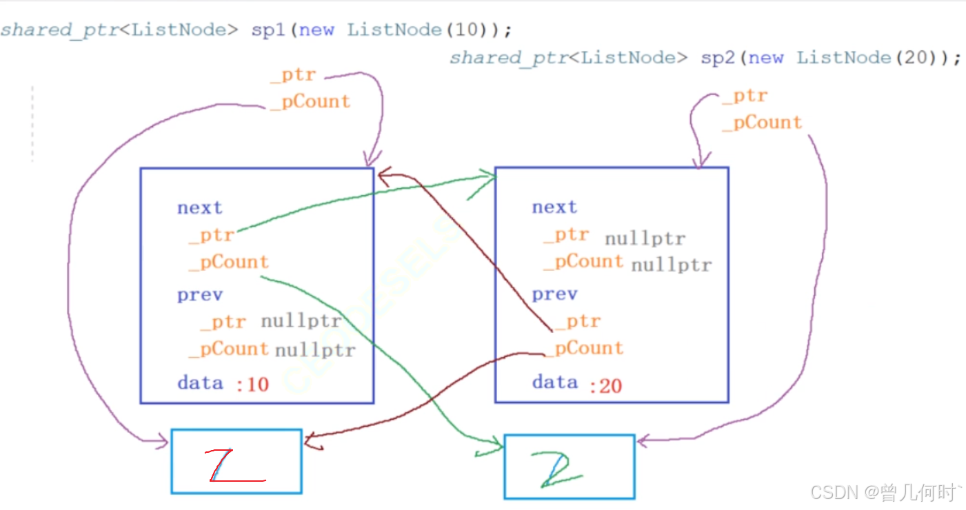 分析:定义出来的sp1和sp2都有如下的结构, 首先sp1是一个智能指针shared_ptr,所以它有它的_ptr和_pCount字段,其次ListNode结构的结点内部有三个成员变量,分别为data next prev,而且这个next和prev它俩也是俩个shared_ptr智能指针对象,也有其自己的_ptr和_pCount,于是定义出来的sp1对象就有如下的结构。sp2结构也和此图一致。