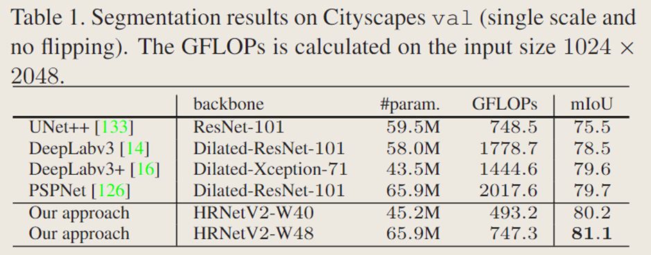 表 1 提供了在参数和计算复杂度以及 mIoU 等级方面与Cityscapes验证集上几种代表性方法的比较。(i) HRNetV2-W40(40 表示高分辨率卷积的宽度)的模型大小与 DeepLabv3+ 相似,计算复杂度更低,但性能更好:比 UNet++ 提升 4.7 分,比 DeepLabv3 提升 1.7 分,比 PSPNet、DeepLabv3+ 提升约 0.5 分。(ii) HRNetV2-W48 的模型大小与 PSPNet 相似,计算复杂度却低得多,因此性能显著提高:比 UNet++ 提高 5.6 个百分点,比 DeepLabv3 提高 2.6 个百分点,比 PSPNet、DeepLabv3+ 提高约 1.4 个百分点。在下面的比较中,文中采用 HRNetV2-W48,它在 ImageNet 3 上经过预训练,模型大小与大多数基于 DilatedResNet-101 的方法相似。