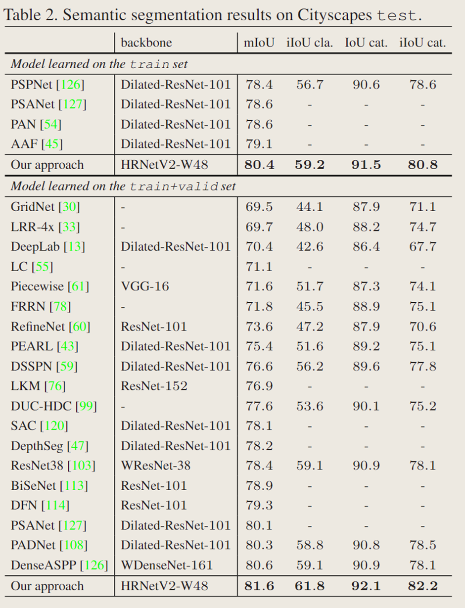 表 2 提供了文中的方法与最先进方法在城市景观测试集上的比较。所有结果均使用了六种比例和翻转。表 2 评估了两种不使用粗略数据的情况:一种是在训练集上学习的模型,另一种是在训练+验证集上学习的模型。在这两种情况下,HRNetV2-W48 都取得了最好的成绩,比之前的先进水平高出 1 分。