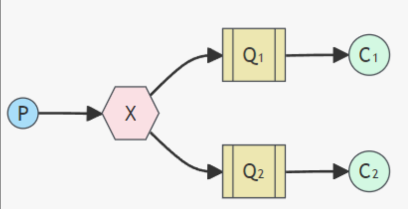 这里介绍的是Publish/Subscribe模式,一个生产者P,多个消费者C1,C2,X表示交换机,这种模式中,生产者P向交换机发送消息,经过交换机,会被路由到Q1,Q2两个队列.消费者C1,C2收到的信息完全相同.这种模式适用于相同消息需要被多个消费者接受的场景