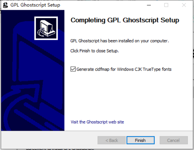 步骤五:安装完成后,注意勾选"Generate cidfmap for Windows CJK TrueType fonts"来生成中文字体配置文件,点击"Finish",如图5所示。