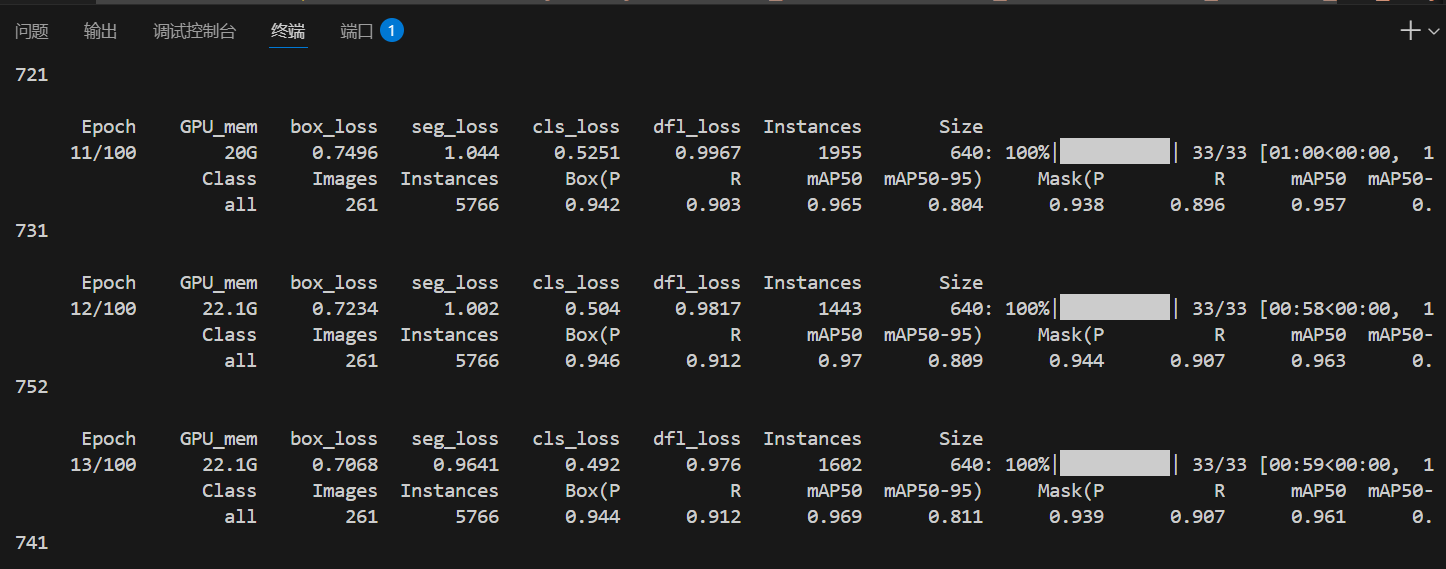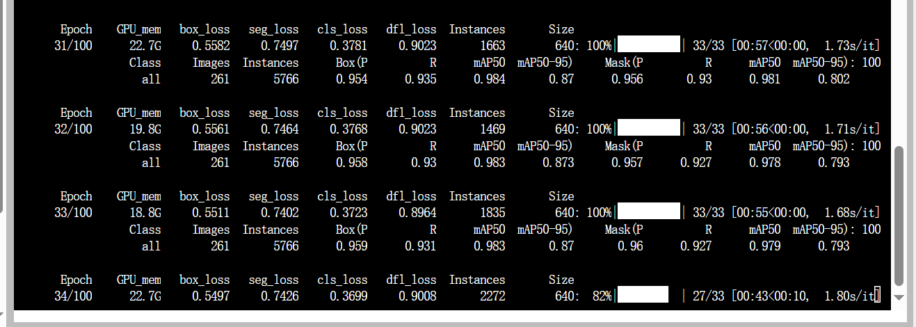 Epoch GPU_mem box_loss seg_loss cls_loss dfl_loss Instances Size