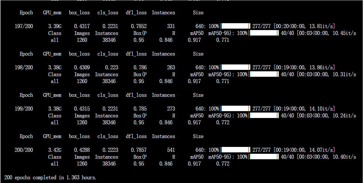 在终端同样是输出类似上内容,(输出每张图片训练进度),并且无法滚动鼠标往上查看,将方法1(输出内容太多,将每张图片的训练进度都进行显示)和方法2(终端输出的内容每三行针对一个epoch,没有显示每张图片训练进度,但是终端只能保留最近5~6epoch的内容,不能滚动鼠标查找之前的内容,只能查看在终端显示的内容)的缺点都集合了