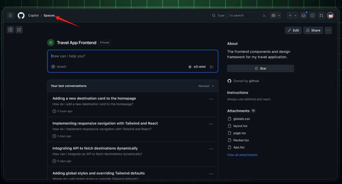 立即登录 github.com/copilot/spaces 体验 Copilot Spaces。这是一个早期预览版。请在空间讨论区或使用内嵌反馈按钮与我们分享您的构建成果。