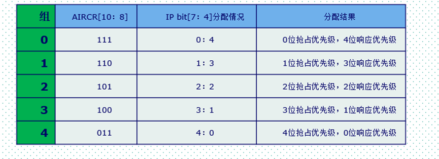 每个IP寄存器的高4位用来设置抢占和响应优先级(根据分组),低4位没有用到。