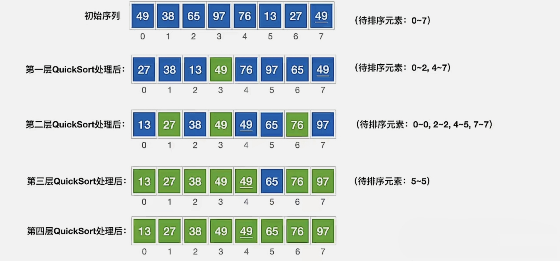 我们把每一层的 quickSort 处理都展示出来,就是下面这个样子,绿色是每一次 quickSort 排好序的元素: