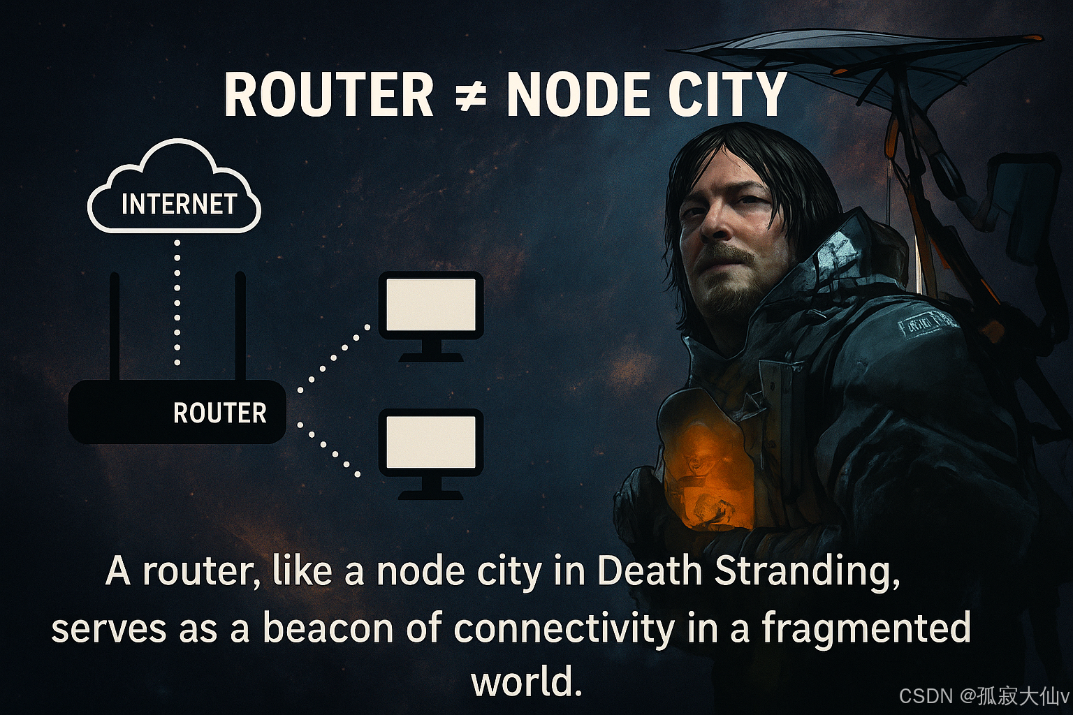 在网络世界中,路由器就像《死亡搁浅》里的"节点城市"。每个路由器都是一个信息孤岛,独立而又互联,负责连接前一个网络与下一个网络,就像连接着一座又一座被隔绝的城市。在广阔的互联网"荒野"中,数据包就是快递员山姆,一步步穿越子网、翻越协议层的高山,最终将信息送达目标设备。