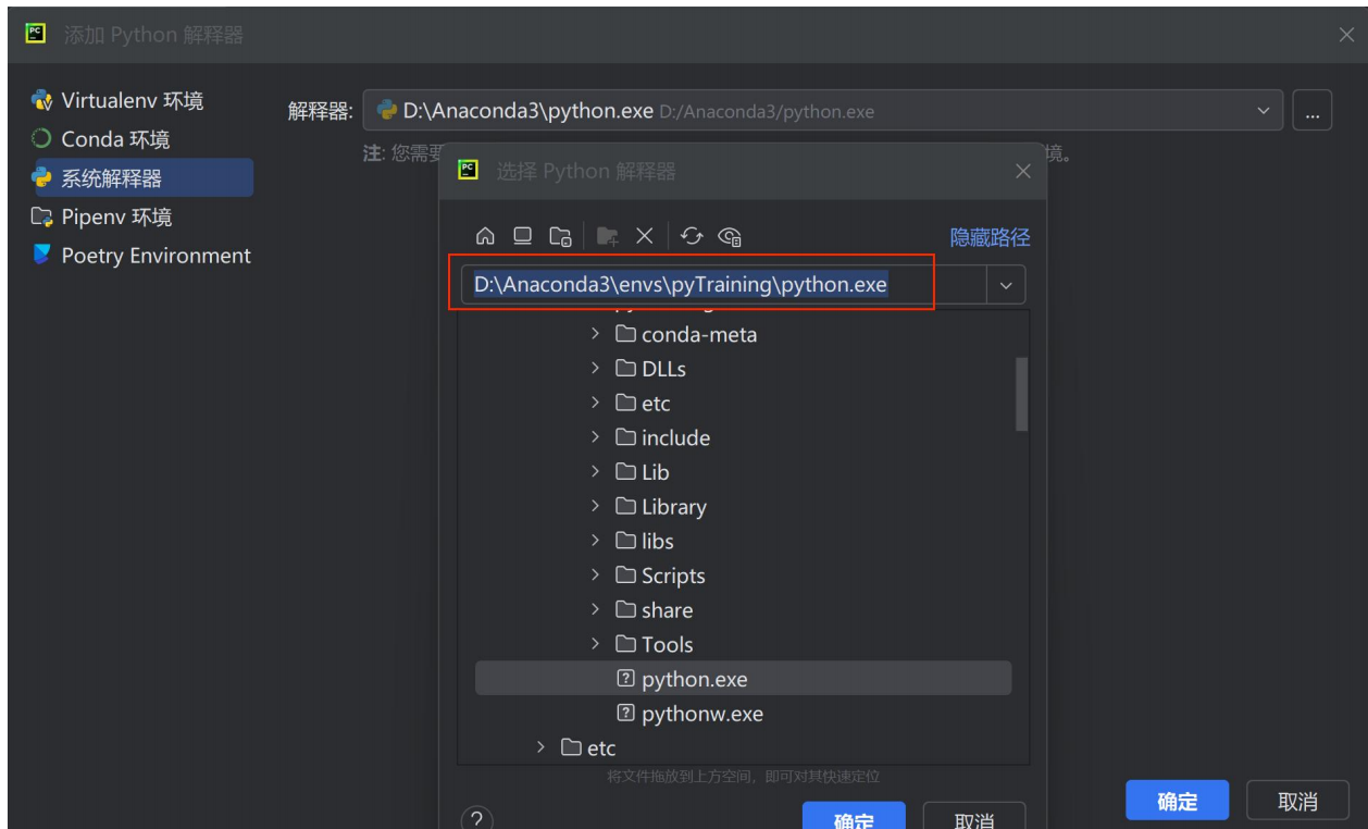 浏览选择新环境下的python.exe路径(如D:\Anaconda3\envs\pyTraining\python.exe)