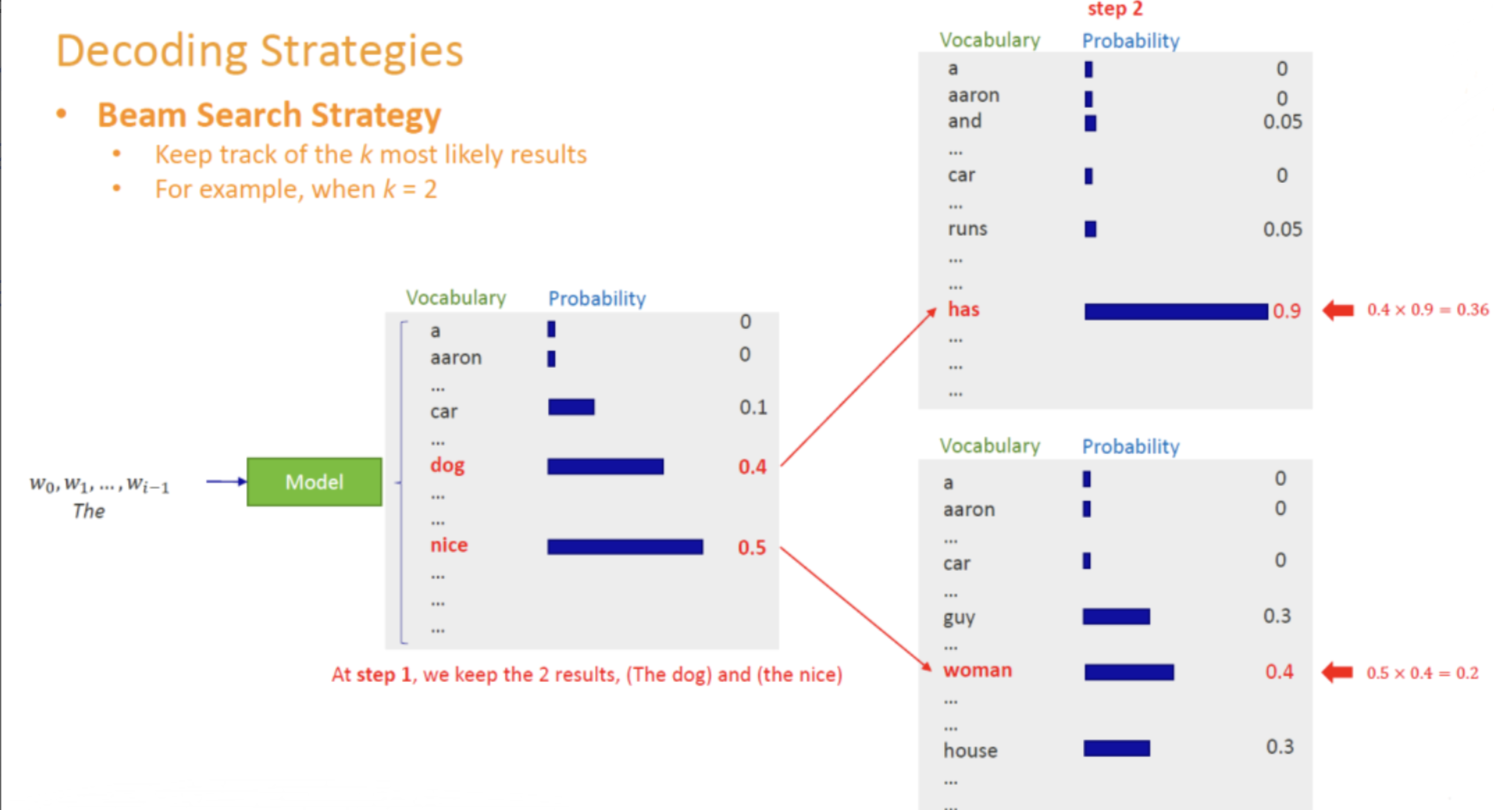 - 在每个时间步,对当前所有候选序列都进行下一步扩展,并按照其(对数)概率打分,保留top k条