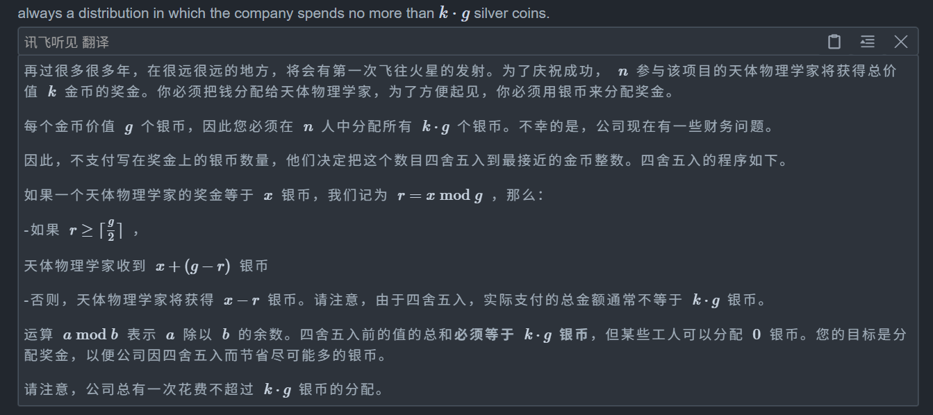 我们很容易想到,我们肯定是每个人分配 (g - 1) / 2 个银币最好,这样就能全贪走剩下的了,同时我们也最多只能贪这么多,我们假设给前 n-1 人分配好了这么多个(假设硬币够多),那么最后一个人最好全收下所有硬币,为什么?